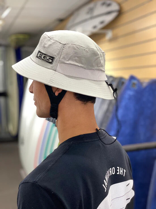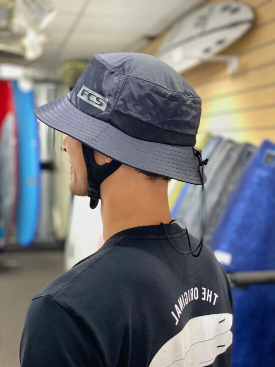 Surf bucket hat designed to stay secure in the surf, providing protection against the sun and the elements.