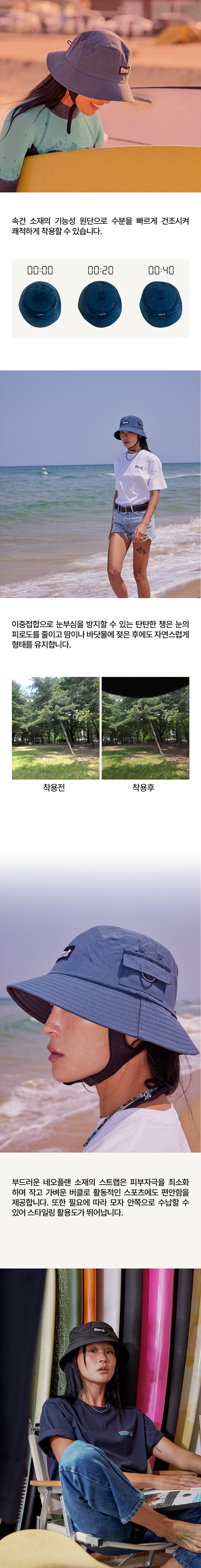 모자 안쪽 정수리 밴드에 턱끈을 고정시키시면 물 밖에서 일상용 버킷햇으로 사용 가능합니다.