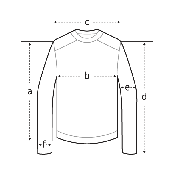 a: 총길이/ b: 가슴단면 / c: 어깨폭 / d: 팔길이