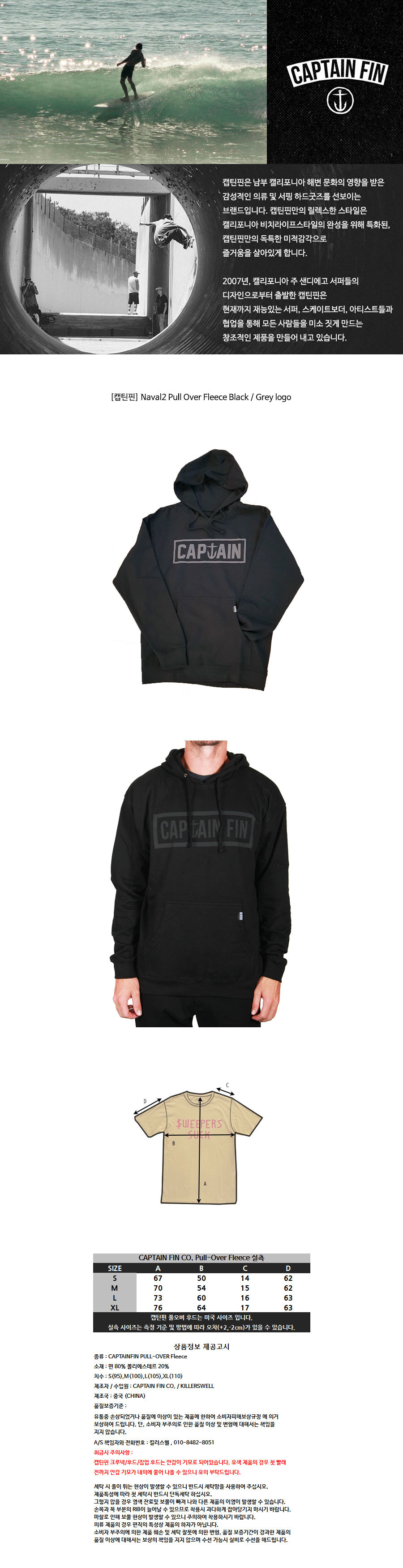 * 캡틴핀 후드/집업후드/크루넥 티셔츠는 오버핏 미국사이즈로 생산되었습니다.