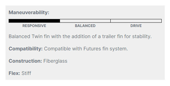 Created with fish shapes like winged swallows in mind, it can be used in for a variety of boards from twins to thrusters.