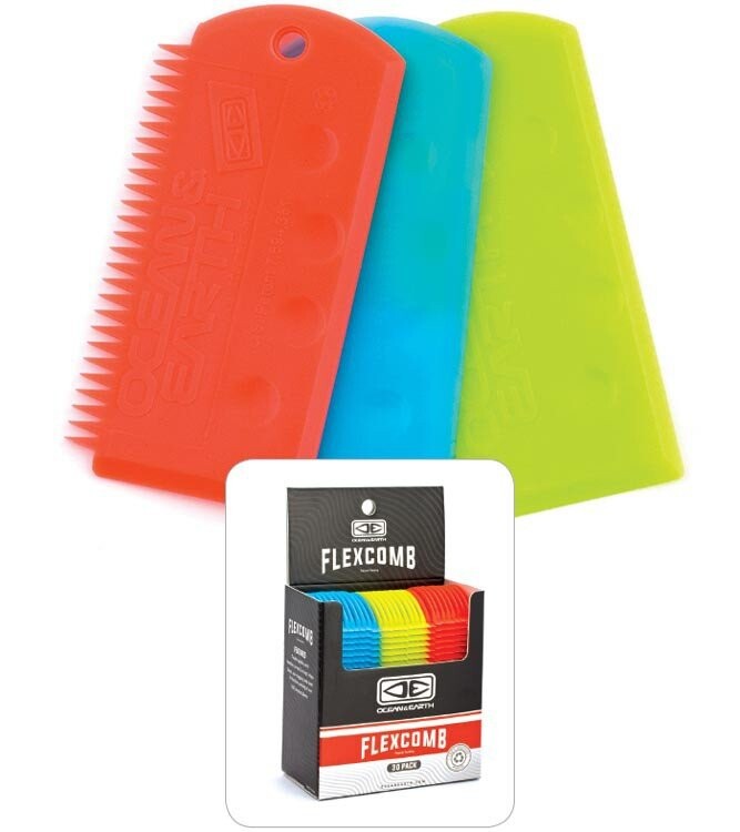 Ocean & Earth Flex Wax Comb Flexcomb Here it is, what surfers have been dreaming about for years; a wax-comb that really works! How many times have you tried to take your wax off, especially on an older board, and the wax just comes off in little strips. Those tedious little pressure dings and heel dents just stay full of wax until you’ve run your wax-comb, at weird angles, through them multiple times. The Flexcomb bends into the dents and can flex and scrape over the rails of your surfboard.
