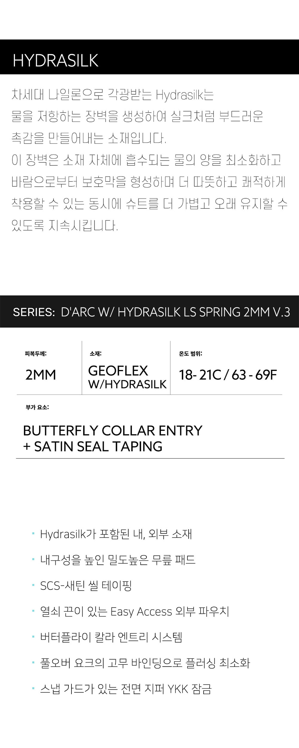 HYDRASILK: The next generation nylon, is a silky-smooth material that creates a hydrophobic (rejects H20) barrier. This barrier minimizes how much water is absorbed into its rubber core and protects against wind, keeping you warmer and drier, while making the suit lighter and longer-lasting. Plus it makes you feel all buttery inside.