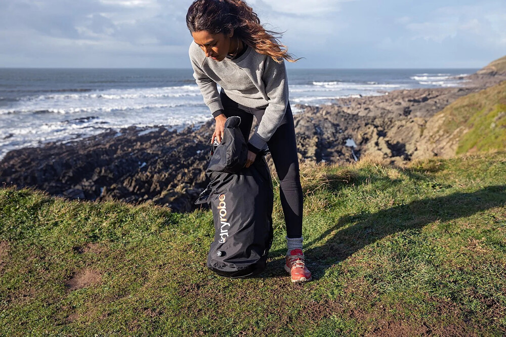 The dryrobe® Compression Travel Bag will comfortably pack any size of dryrobe® Advance or Towel dryrobe®. Simply put the changing robe in the bag, rollover and clip the top, twist the valve open, squash all of the air out by kneeling on it, then pull the compression straps tight and twist the valve closed.