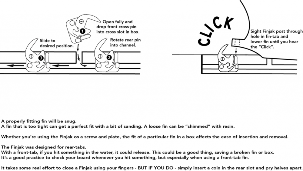 핀잭은 서프보드및 SUP보드의 센터핀용으로, 핀의 스크류-탭 위치가 앞쪽(전면), 뒤쪽(후면) 상관없이 간편하게 설치하여 툴-프리(Tool-Free)로 편하게 사용 가능하지만 스크류-탭의 위치가 앞쪽에 있는 센터핀(Front-tab)의 경우, 물속에서 일정 강도 이상의 외부 충격이 가해지면 핀 이 빠질 수도 있으므로 핀에 외부 충격이 있을시 핀을